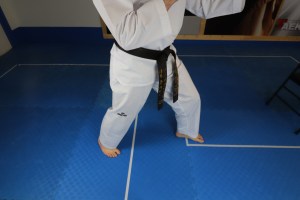 Application: Another very strong stance, used for reaching in while striking. If stepping in with a block and front stance, usually a quick strike will follow because you are closer to the opponent.
